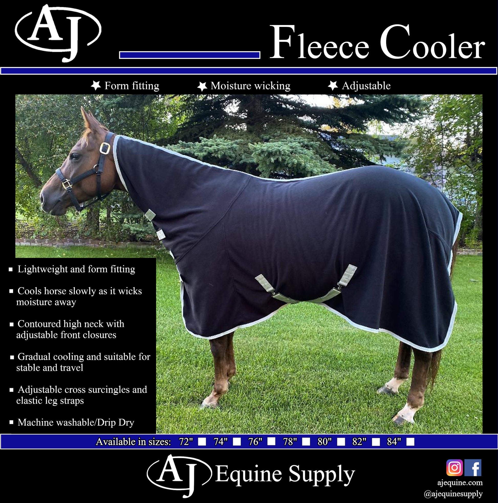 This warm lightweight polar fleece cooler is ideal for cooling and drying your horse after those winter rides.  The adjustable straps make this polar fleece great for traveling. The full neck provides maximum coverage for reduced drying time.